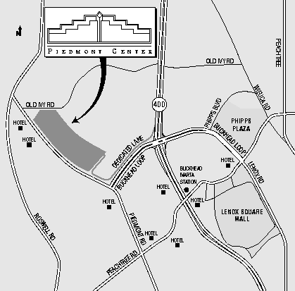 Piedmont Center is equipt with 6 driveways (two of which are regulated by traffic lights) to enter and exit the development. The driveways provide easy access to Piedmont Road, Roswell Road, Old Ivy Road, the Buckhead Loop and Peachtree Road. They offer immediate Access to GA-400, connecting I-85, I-75 and/or I-285.