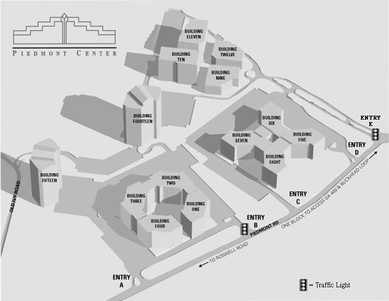 Aerial View... Below is shown an aerial view of the Piemont Center complex reflecting each building, roads connecting the complex internally, parking areas and Piedmont Road the main artery to our complex. Note our facility is complete with 2 street lights making access easy.